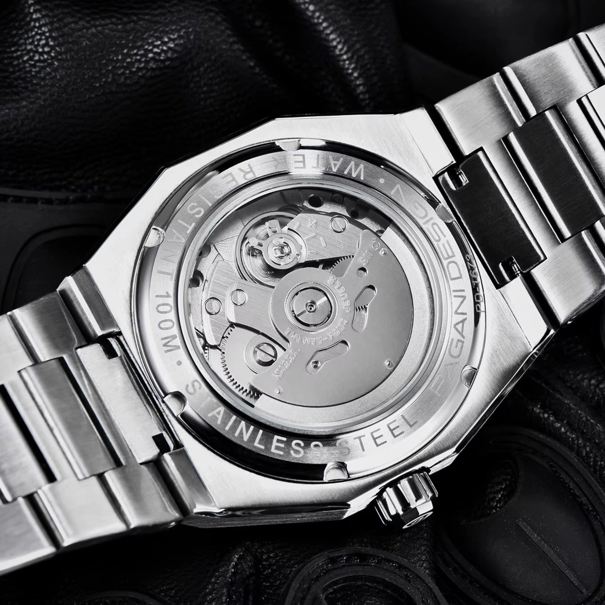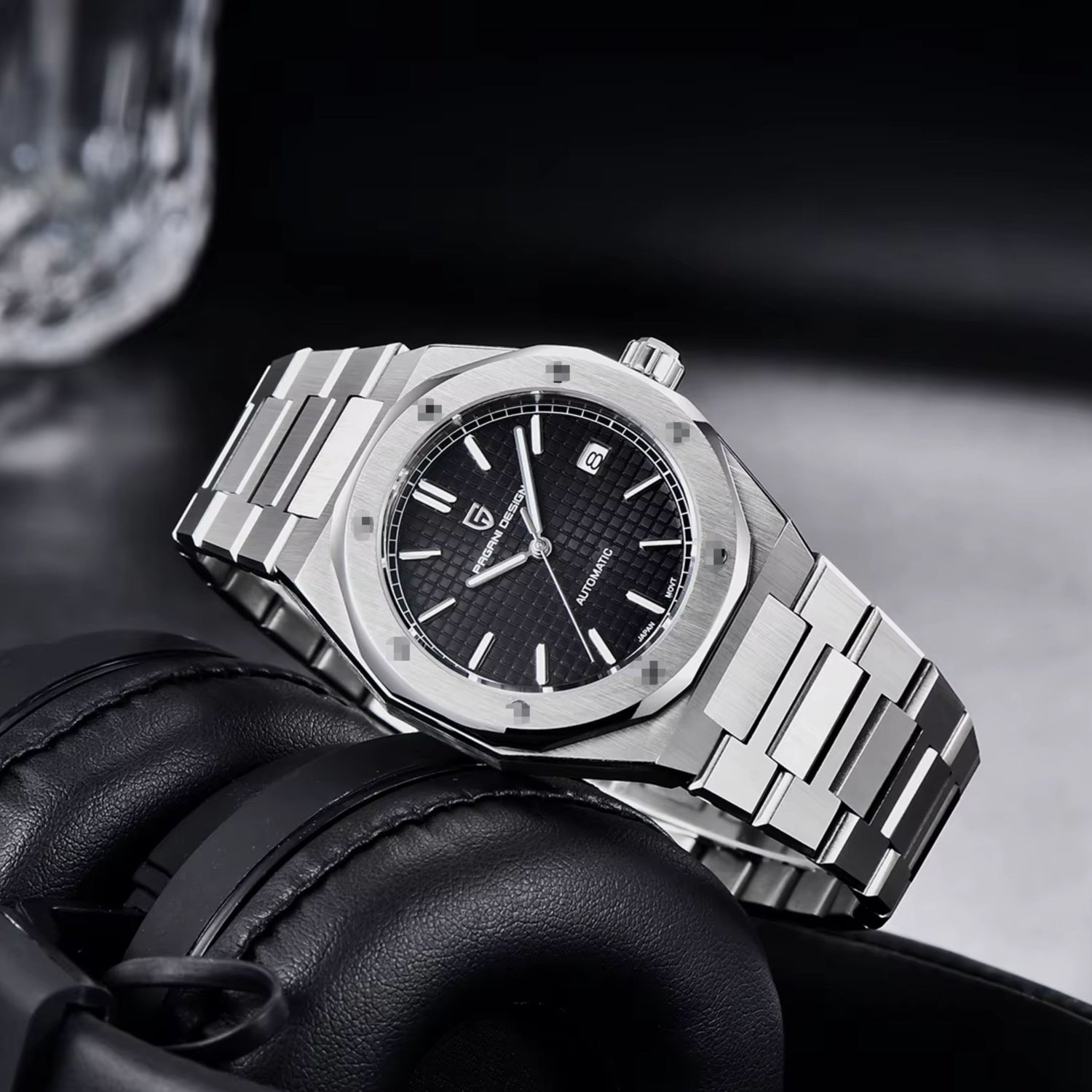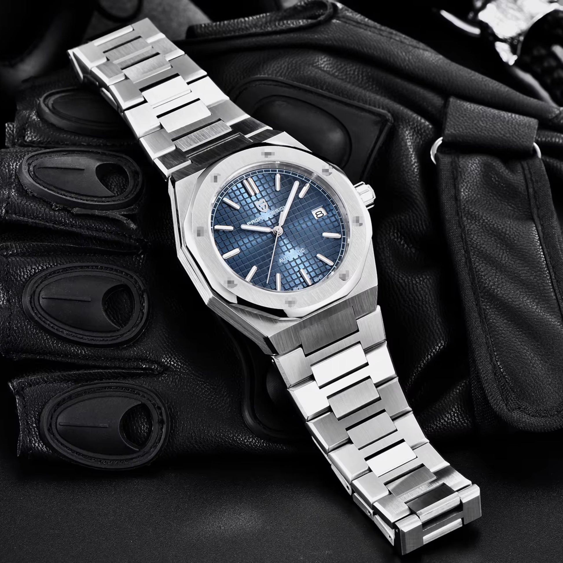 El PAGANI DESIGN PD-1673 incorpora el confiable movimiento automático SEIKO NH35, reconocido por su precisión y durabilidad. Su diseño inspirado en el Royal Oak combina líneas deportivas con acabados de lujo, ideal para quienes valoran la ingeniería detrás del estilo.