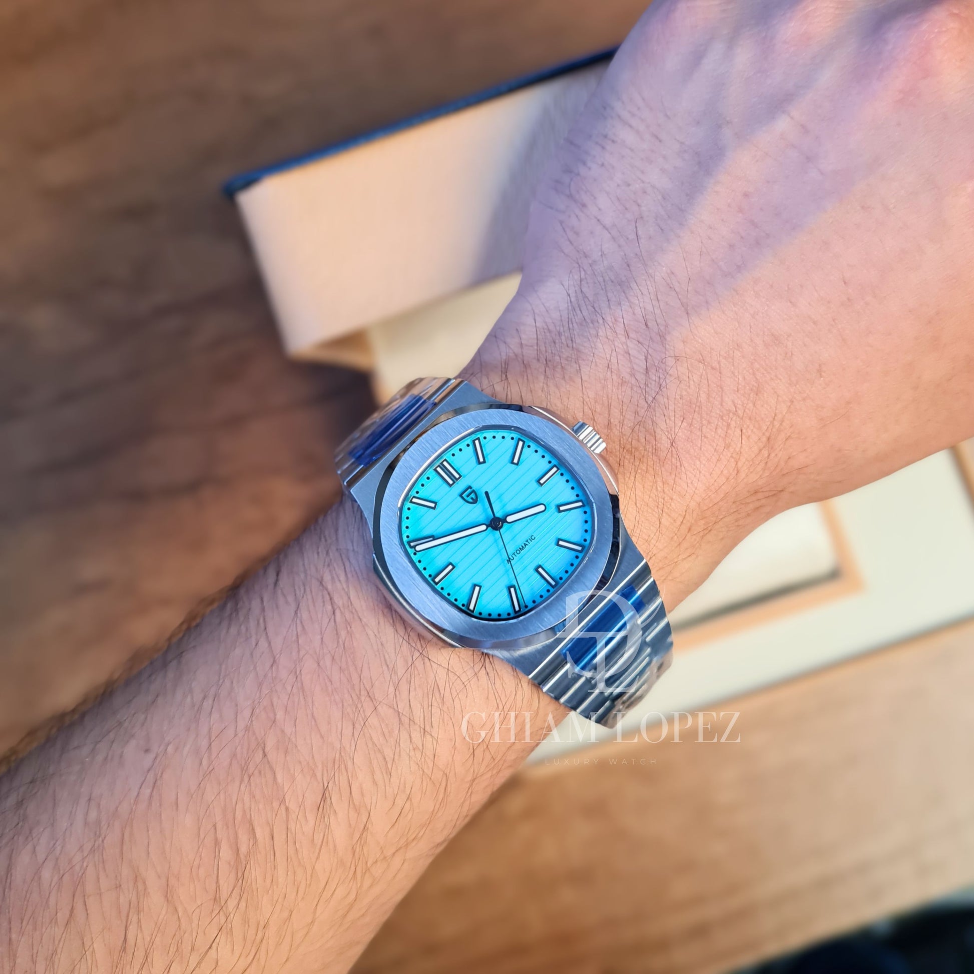 El PAGANI DESIGN PD-1728, homenaje al legendario Nautilus de Patek Philippe, destaca por su diseño elegante y mecánica de alto nivel. Fabricado en acero inoxidable 316L, cuenta con una caja de 40 mm, cristal de zafiro antirreflejos y movimiento automático con 36-40 horas de reserva. Su carátula negra texturizada, combinada con una correa de piel genuina, ofrece presencia y comodidad en todo momento. Resistente al agua hasta 100 metros y con un peso equilibrado de 133 gramos, este modelo no solo marca el tiempo, sino tu estilo.